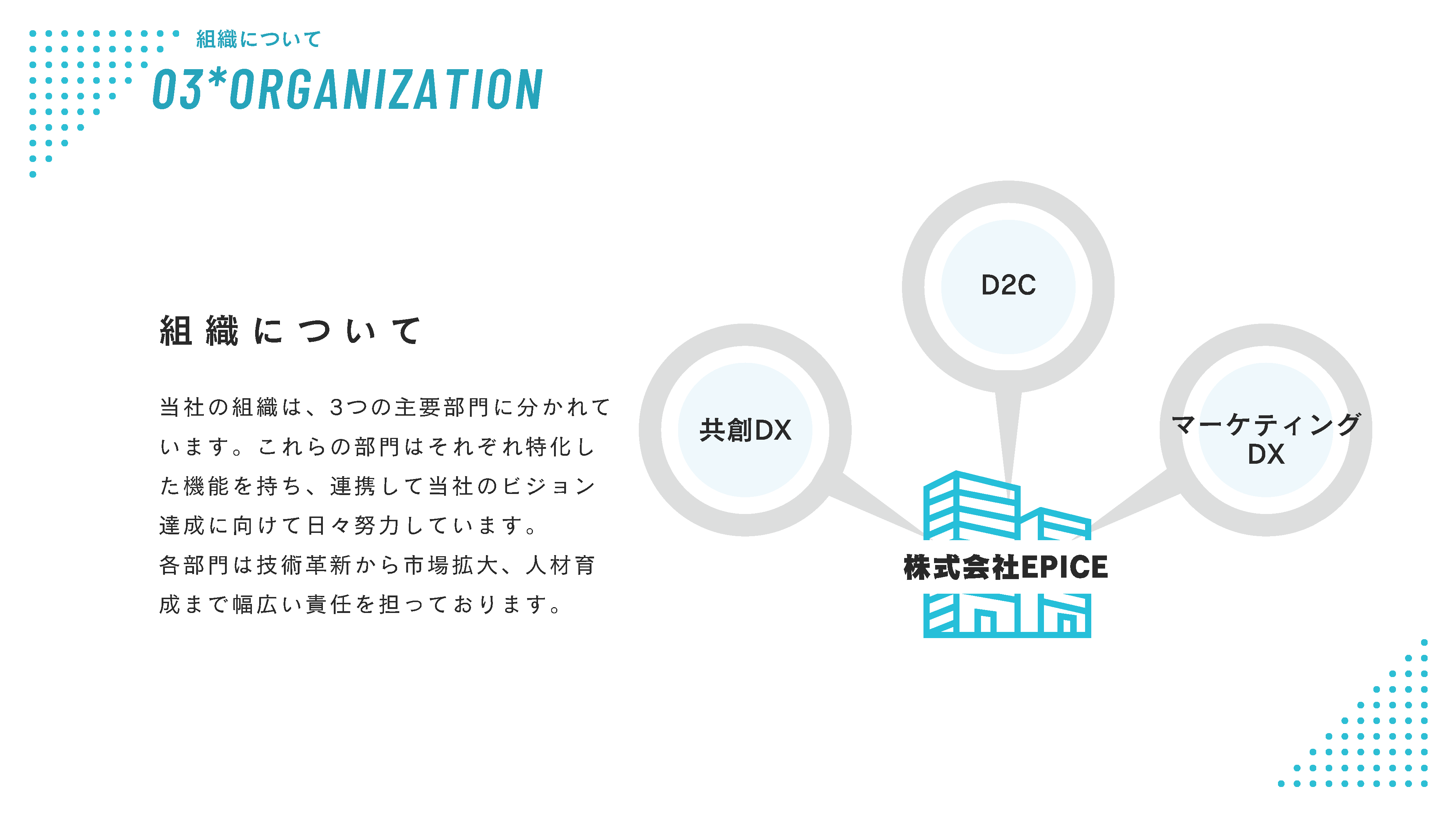 EPICEは、D2C事業・共創DX事業・マーケティングDX事業の3つを展開しています。